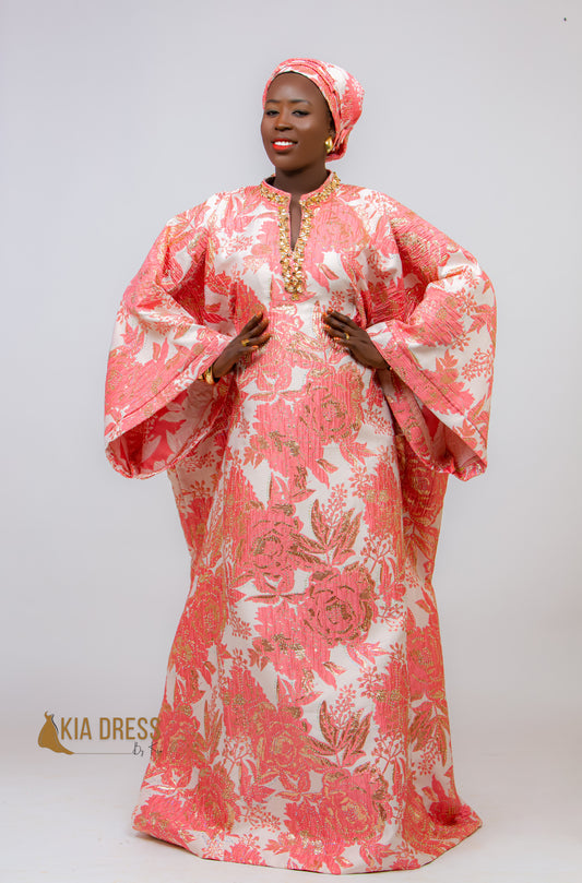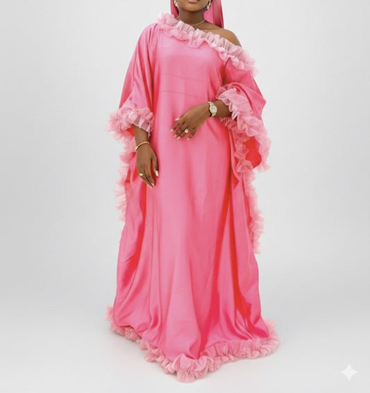 Boubou long rose en soie avec finitions en organza