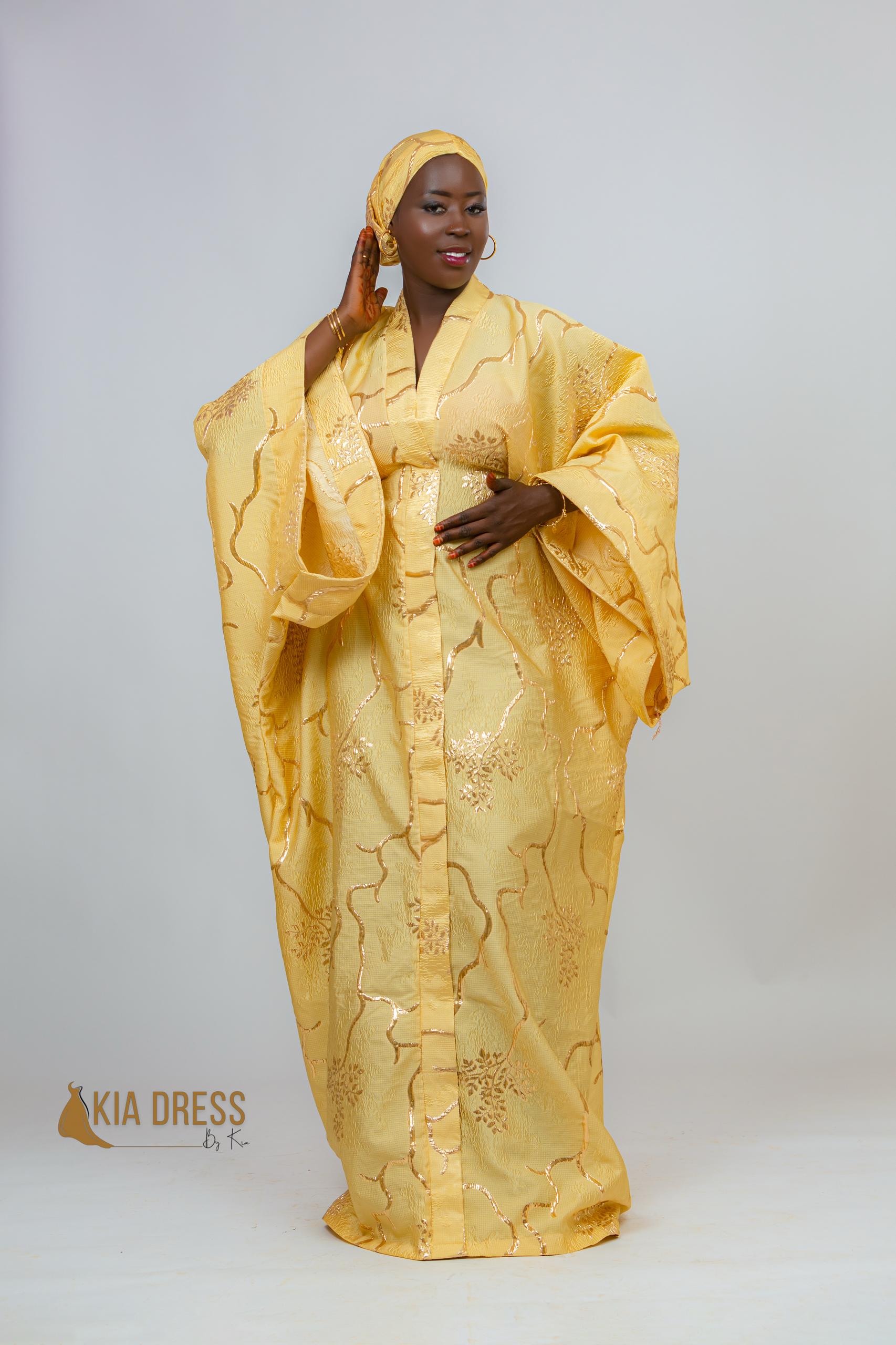 Avec sa coupe ample et son tissu brocart structuré, ce boubou offre une allure majestueuse. Les attaches intérieures permettent de marquer la taille et de souligner la silhouette avec style. Un incontournable chic et tendance.