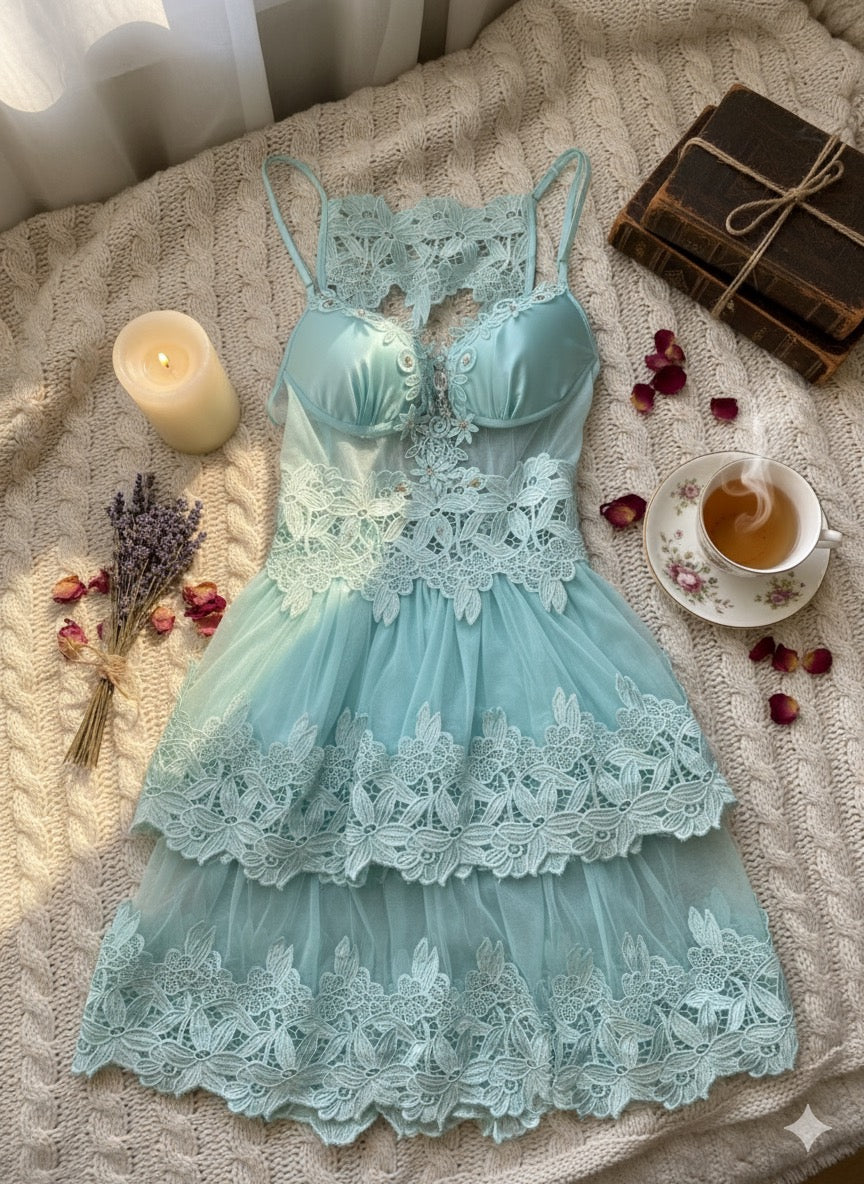 Nuisette en tulle et dentelle, cintrée à la taille et évasée pour une allure féminine et légère. Un mélange parfait de douceur, d’élégance et de sensualité.