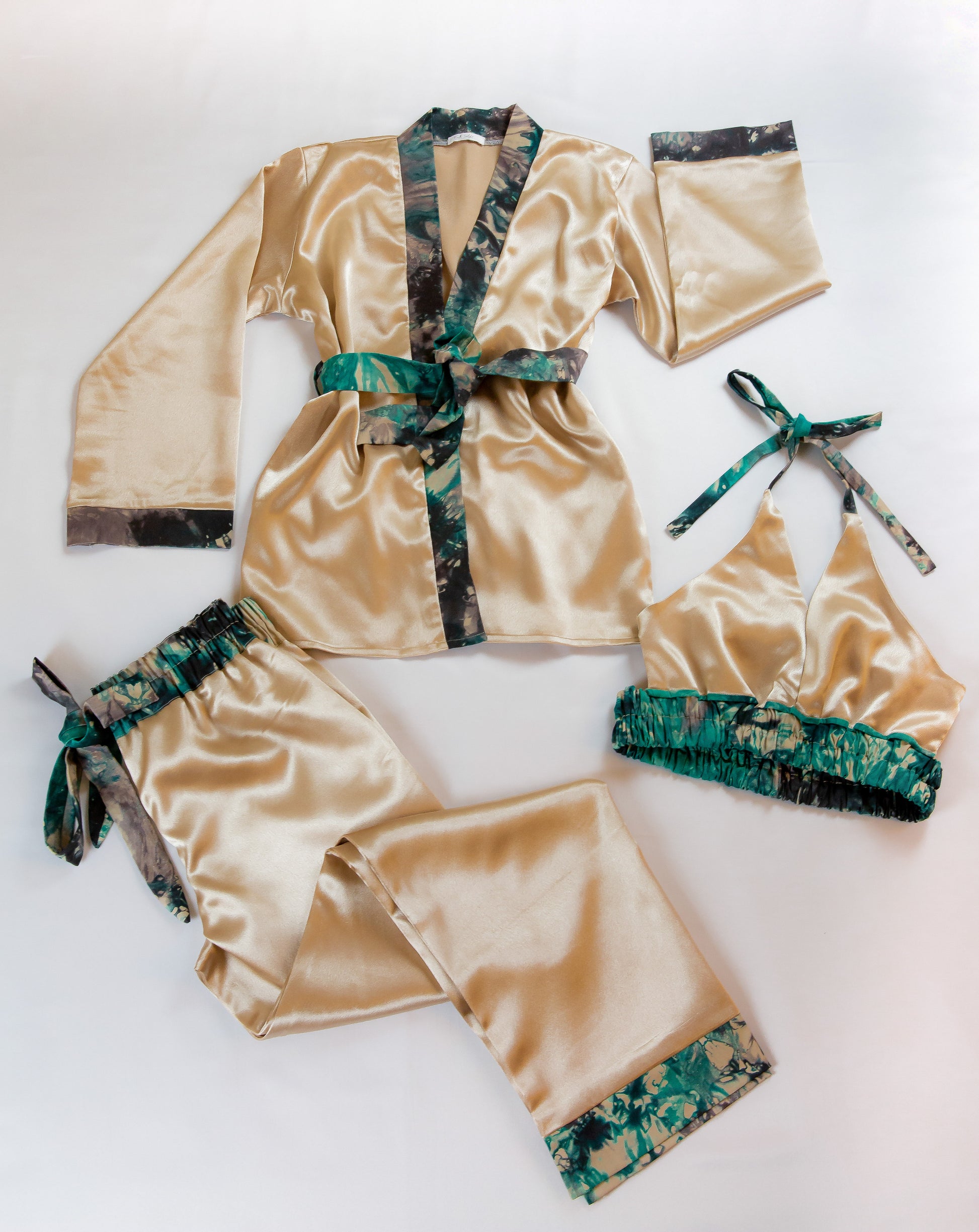 Ensemble en soie réhaussé de touches de tissu traditionnel du Burkina Faso. Composé d'un pantalon fluide, d'un petit haut léger et d'un gilet court, il allie élégance, confort et héritage culturel.