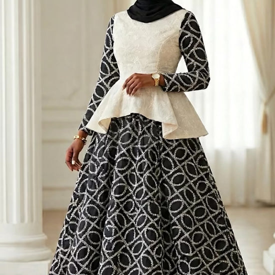 Cette robe longue se distingue par son architecture : un haut brodé lumineux qui structure la posture, prolongé par une jupe fluide aux motifs géométriques intemporels.